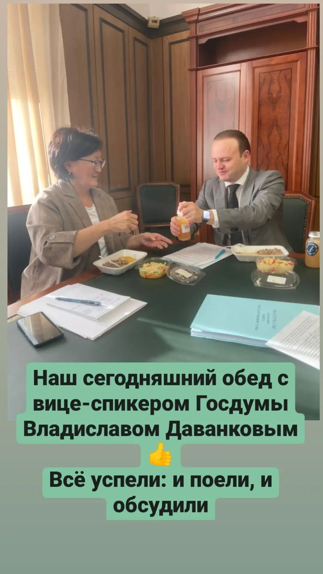 Недавно фото своего обеда опубликовала и депутат Сардана Авксентьева. Она очень скромно пообедала за служебным столом вице-спикером Госдумы. Никаких деликатесов: гречка да капустный салат.